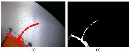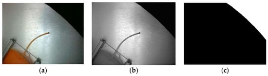 The input tube of the plasma bag was recognized by first extracting the bag’s color [,,,] and constructing a corresponding color image. Then, the Euclidean distance between each pixel in the camera-captured image and each pixel in the constructed-color image was calculated. Following optimization and experimentation, a recognition distance of Dos = 25 was selected for the input tube’s color identification. Any pixel in the sampled photo whose distance to the similar pixel in the image was less than Dos satisfied the recognition distance criterion. A mask image was then constructed based on the corresponding pixel points in the sampled photo, with the input tube’s position marked as 255 and all other unsatisfied pixel values set to 0, resulting in the mask image of the input tube’s location, as shown in Figure 9a.