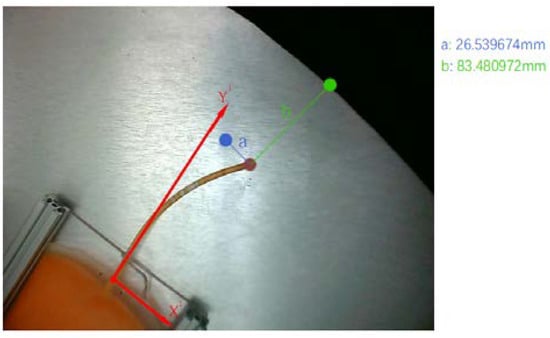 In this study, after obtaining the pixel distance, we converted it to linear distance [,]. The triangulation method was employed to calibrate the actual distance as the scaling ratios for the horizontal and vertical directions in the image were not the same, which required calibration of two sets of points to solve the equation. The following two equations were used: