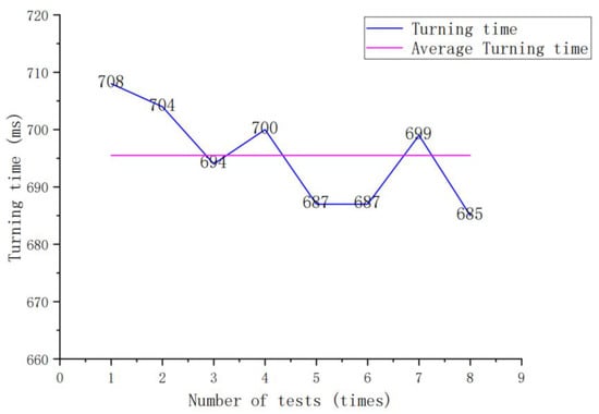 The experimental results presented in Figure 11 demonstrate that the average rotation time was 695.5 ms. The graph also shows that the angle fluctuation range of the gearbox stepper motor was small and stable.