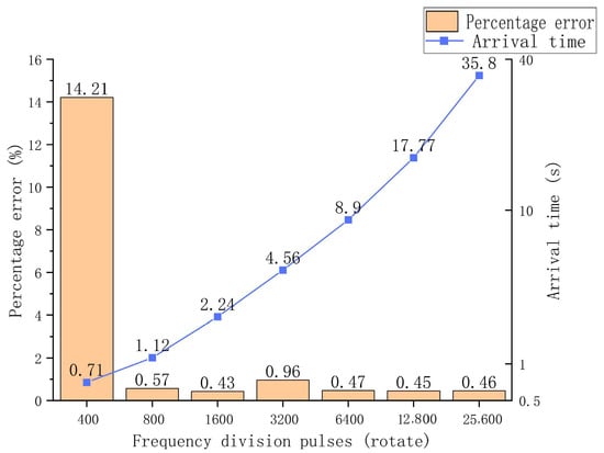 Figure 12 shows that the stepper motor experienced a significant loss of step at a frequency division pulse of 400. However, after removing this data, the remaining data exhibited minor fluctuations and good stability. The system required the slide to travel a maximum distance of 50 mm, had a camera first shot time of 0.3 s and a complete pallet rotation time of 2.5 s, allowing ample time for system movement. Additionally, the error ratio satisfied the selection criteria, and thus the pulse 800 frequency division was selected.