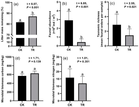 - Hou, P.C.L.; Zou, X.M.; Huang, C.Y.; Chien, H.J. Plant litter decomposition influenced by soil animals and disturbance in a subtropical rainforest of Taiwan. Pedobiologia 2005, 49, 539–547. [Google Scholar] [CrossRef]