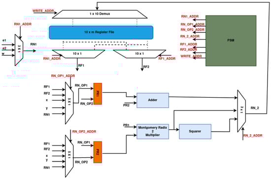 The proposed two-stage pipelined architecture includes adder, multiplier, and squarer units, as shown in Figure 1. To implement the adder unit, m bitwise exclusive OR gates are used, where m represents the key length. Multiplication is a crucial operation in cryptographic applications, and there are several techniques available in the literature. In this work, we utilize the Montgomery radix-2 multiplier, which is discussed in detail in Section 5.5.1. The squarer unit is placed after the multiplier unit, as seen in Figure 1. By adding a “0” after each input data value, the squarer unit is implemented, as described in [31]. The squarer unit’s purpose is to minimize the total number of clock cycles (CCs) required for PM calculation, as instructions such as can be computed using the squarer unit. After each polynomial multiplication and squaring unit, an inverse operation is necessary. The quad block Itoh–Tsujii method [15] is employed using the multiplier and squarer units to execute the inversion operation.