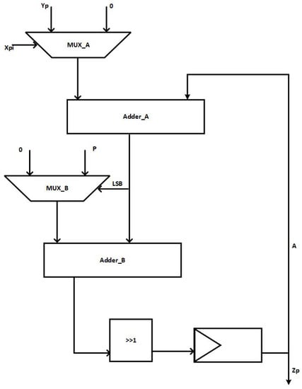 The proposed hardware architecture for the radix-2 Montgomery multiplier is illustrated in Figure 2. The architecture comprises two multiplexers: MUX_A and MUX_B. MUX_A and MUX_B both have a size of . MUX_A is responsible for selecting the partial product , which is either Yp or 0, depending on the value of . Once the appropriate is selected, it is added to the output . The least significant bit (LSB) of Adder_A is input into MUX_B, where it selects either 0 or the prime number. The remaining bits of Adder_A are then added to the output of MUX_B and shifted right by 1. The final output is computed by performing n iterations of this process.