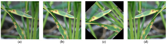 Wheat image enhancement. (a) Original image; (b) contrast enhancement; (c) rotation 45°; (d) horizontal flip.
