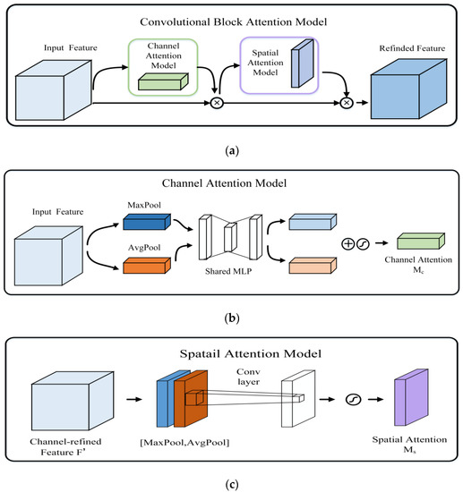 CBAM module diagram. (a) CBAM architecture; (b) channel attention; (c) spatial attention.