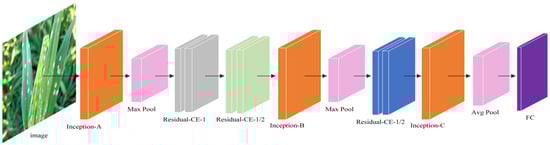 Therefore, this paper proposes a multiscale CNN information fusion model with multiple attention mechanisms, named Inception-ResNet-CE (IRCE) model, as shown in Figure 5. This model is an efficient and lightweight neural network model suitable for mobile devices, which can efficiently and quickly identify wheat diseases in complex backgrounds. The model framework includes six Residual-CE structures (as shown in Figure 6), three Inception structures (as shown in Figure 7), three pooling layers, and a fully connected layer.