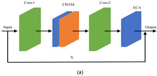 In order to improve the model’s attention to the disease characteristics of wheat leaves, we tried adding the five attention mechanisms of CBAM, NAM, SE, CA, and ECA to the residual structure. First, taking into account CBAM and NAM with mixed attention mechanisms, we chose CBAM as it had a better performance after comparison. Since CBAM passes features through the channel attention mechanism and spatial attention mechanism in a linear manner, channel features are lost to a certain extent. Therefore, we added another layer of the channel attention mechanism. After comparison, ECA was better than CA and SE. We found that the combination of CBAM and ECA had the best effect on focusing on diseased regions and improved the detection performance of the model.