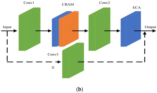 The Residual-CE module can recombine the features of the original wheat disease image, which is beneficial to the learning of the model. Residual-CE can also map samples from high-dimensional feature space to low-dimensional feature space, and make the mapped samples still have excellent separability. The Residual-CE-1 structure includes two 3 × 3 convolutional layers, a CBAM module, an ECA module, and an identity map. The Residual-CE-2 adds a 1 × 1 convolution short link to Residual-CE-1.