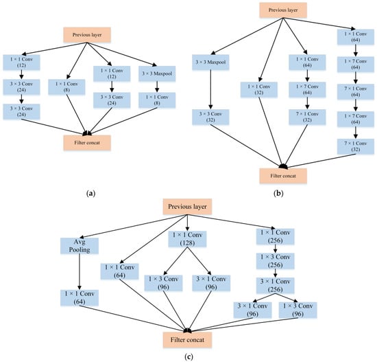 Inception structure. (a) Inception-1; (b) Inception-2; (c) Inception-3.