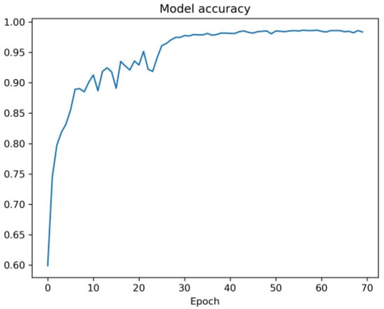 There are five groups of experimental comparisons in this paper. The first group selects an appropriate optimizer. The second group explores the impact of the inception module on the model. The third group explores the effect of attentional mechanisms on the model. The fourth group compares the proposed model with the current mainstream algorithms in terms of performance and accuracy. The fifth group compares the proposed model with the classic lightweight CNN models. We set the basic parameters: epoch = 70, learning rate = 0.001, batch_size = 64, weight_decay = 0.001, step_size = 25, and gamma = 0.01. Figure 8 shows the accuracy curve of the IRCE model on the training dataset. It can be seen from the figure that the accuracy rate increases rapidly in the early training. When the model is between 10 and 30 epochs, the accuracy rate fluctuates, but the overall trend is rising. After 30 epochs, the accuracy rate starts to converge slowly, and when the model reaches 40 epochs, the training accuracy basically stops and approaches a stable value.