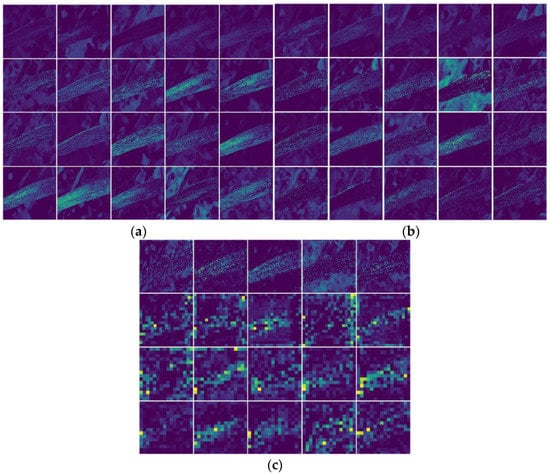 Figure 9 shows the feature maps of layer 1, layer 2, and layer 3 of the model. The first row of the feature maps does not have any Inception module, the second row contains the Inception-1 module, the third row contains both the Inception-1 and Inception-2 modules, and the fourth row contains all three Inception modules. The shallow layers of the model mainly extract features such as image texture, edge, and color. The deep feature maps of the model reduce the visual information of the image and increase the abstract information. The model without any Inception module loses a lot of disease features. Adding more Inception modules enhances the model’s ability to integrate the features in the shallow feature maps with the deep semantic information, highlighting the characteristics of the diseased area. The feature map of layer 3 for the model without any Inception module in Figure 9c still preserves clear visual information of the image, which may be caused by the insufficient depth of the model.