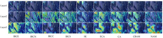 In the experiment, we investigated how CBAM, NAM, SE, CA, and ECA affected the performance of a residual structure model, and designed nine sets of experiments to compare their effects. Table 5 shows the results of adding different attention mechanisms to the model. The table indicates that adding an attention mechanism has little impact on the number of model parameters and computations. Adding only one attention mechanism improves the accuracy, precision, recall, and F1-score of the model for all mechanisms except CA; ECA is the most helpful to the model, as evidenced by the increase in its accuracy, precision, recall, and F1-score by 0.59%, 0.51%, 0.62%, and 0.57%, respectively. Adding two attention mechanisms increases the detection accuracy of the model by 1.18–2.71%, with CBAM + ECA working best. To further explore the role of the attention mechanism, we used Grad-CAM to draw a heat map of the model with the attention module and visualize the network’s focus area on wheat diseases. Figure 10 shows that each row corresponds to a residual layer and each column corresponds to the added attention mechanism. The model with an added attention mechanism can focus on the diseased area of wheat leaves, effectively obtaining the relevant information in the pictures, which is very helpful for disease identification.