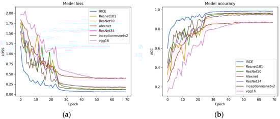 To test the performance and effect of the proposed model, we compared it with six classic CNN models: AlexNet, VGG16, ResNet34, ResNet50, ResNet101, and InceptionresnetV2. After training, we drew the loss and accuracy curves of the seven models, as shown in Figure 11, to clearly and quickly compare the accuracy of the algorithms. The figure shows that the loss curves of InceptionresnetV2, ResNet34, ResNet50, and ResNet101 converge at the same speed as the ACC curves, slightly faster than those of the VGG16 and AlexNet models. Our IRCE model not only has the lowest training loss and the highest training accuracy but also the fastest convergence speed.