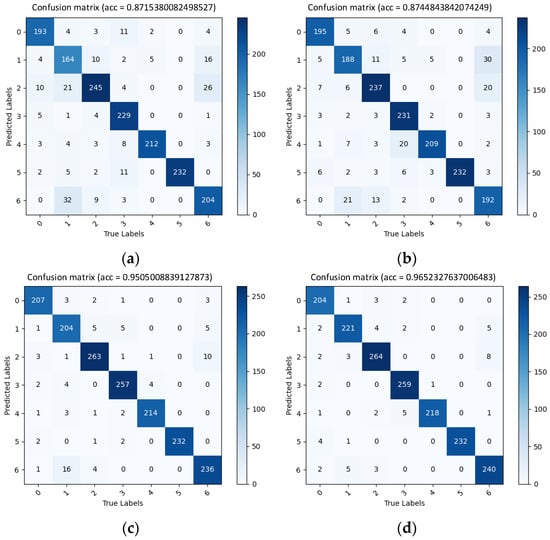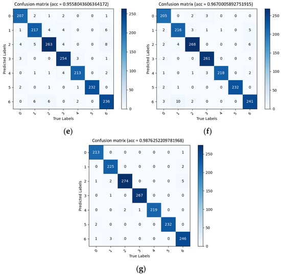 Seven model confusion matrices. (a) AlexNet; (b) VGG16; (c) ResNet34; (d) ResNet50; (e) ResNet101; (f) InceptionresnetV2; (g) IRCE.