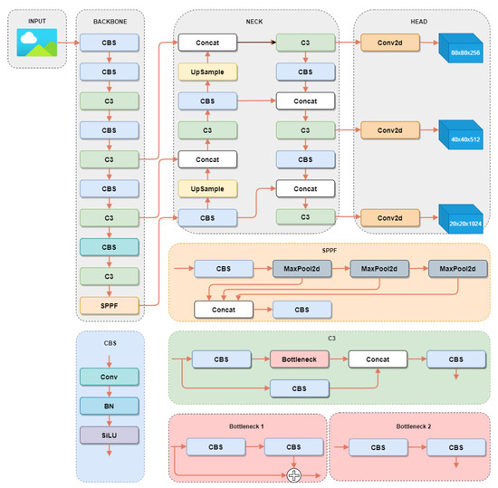 Backbone: The Backbone component is the network’s main feature extractor. It is in charge of extracting features from the input image through the use of a series of convolutional layers. The backbone component in YOLOv5 consists of a modified version of the Conv module, C3 module, and Spatial Pyramid Pooling—Fast (SPPF [17]) module. Convolution, batch normalization, and SiLU activation are all included in the Conv module. The C3 module is based on the CSPNet [27] concept and includes three standard convolutional layers as well as multiple bottleneck modules. The SPPF module employs serial maxpool to perform multiscale fusion in order to expand the receptive field’s feature map.