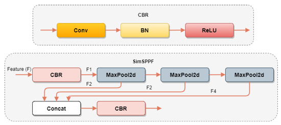 The SimSPPF module was used in our model in this research project. The decision to use the SimSPPF module was based on the observed advantages of SimSPPF over SPPF, such as the reduced computational complexity and higher FPS while maintaining good object detection accuracy. The equations are shown in Equations (1)–(5) [33].