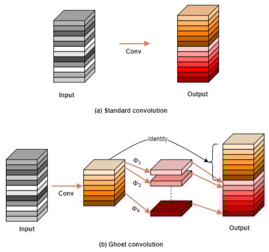 We can discover that some features are similar by visualizing some feature maps, and we can obtain them by performing some simple operations instead. Equation (7) can be used to generate m intrinsic feature maps , where represents the convolution filters, and it is similar to Equation (6). However, we only work with partial convolutions and generate the remaining feature maps with a linear operation, as shown in Equation (8).