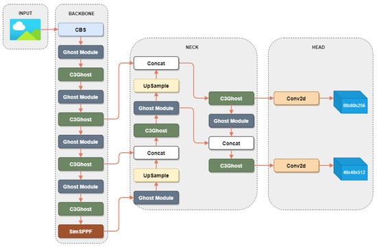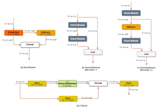 The Conv and GhostConv modules both have the same number of input and output channels. The number of input channels is , and the number of output channels is . Figure 4 depicts the detailed structure of YOLOv5 with GhostNet.
