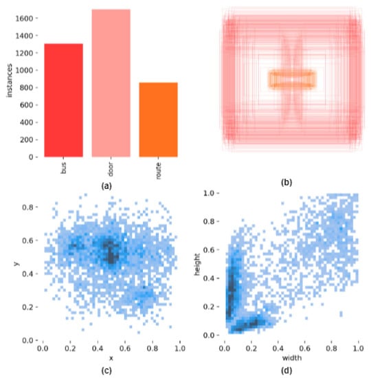 Visualization of the dataset. (a) Number of annotations per class. (b) Visualization of the location and size of each bounding box. (c) The statistical distribution of the bounding box position. (d) The statistical distribution of the bounding box sizes.
