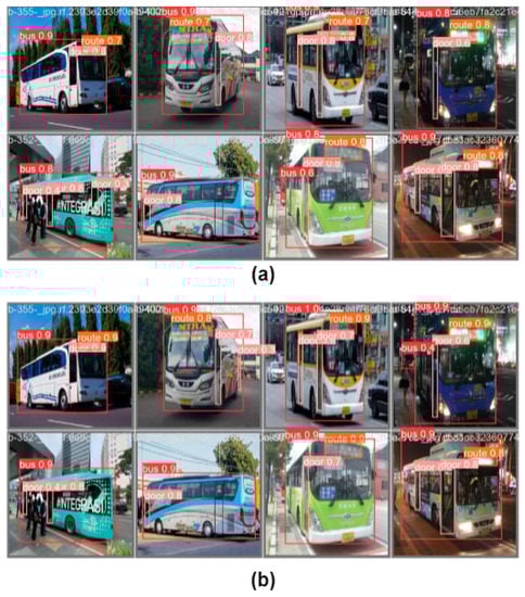 In this study, the accuracy of two models was compared: YOLOv5n and Improved-YOLOv5. The baseline model for comparison was the YOLOv5n because it has the same depth and width structure as the Improved-YOLOv5. To avoid overfitting, the YOLOv5n and Improved-YOLOv5 models were trained for 1000 epochs with early stopping. Early stopping is a regularization technique that halts training if the model’s performance on a validation set stops improving after a certain number of epochs, called the “patience”. The patience was set to 100 epochs in this case. Both models’ performance on the validation set was monitored during training. When the models failed to improve their validation performance after 100 epochs, the training was halted to avoid overfitting. The Improved-YOLOv5, on the other hand, was stopped earlier than YOLOv5n, at epoch 816 versus epoch 517, indicating that it was better able to learn and generalize the data features. The ability of the Improved-YOLOv5 to continue training for a longer period of time suggests that it was less vulnerable to overfitting than YOLOv5n. This could be because the Improved-YOLOv5 had a better architecture or a more appropriate hyperparameter configuration, which resulted in better model generalization. Ultimately, the improved ability of the Improved-YOLOv5 to generalize its features and avoid overfitting may have led to the better performance compared to YOLOv5n. Comparison of the detection results of the different models is shown in Figure 8, which contains a visual comparison of the detection results obtained by the two models, YOLOv5n and Improved-YOLOv5. The figure shows how the two models performed in terms of detecting buses in images, and it can provide a clear comparison of their accuracy.