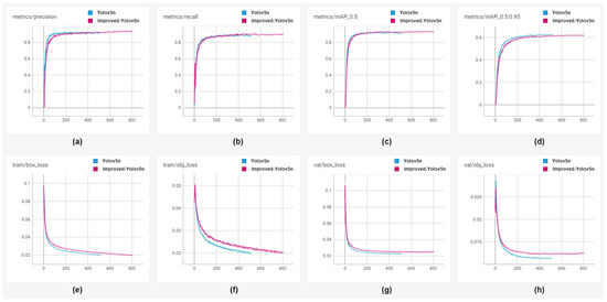 Comparison of the models’ accuracy. (a) Precision. (b) Recall. (c) mAP@0.5. (d) mAP@0.5:0.9. (e) Train/box_loss. (f) Train/obj_loss. (g) Val/box_loss. (h) Val/obj_loss.