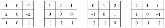 - Edge Difference (ED). The ED method applies the Sobel edge detectors, which are commonly used in the field of image processing, to extract the boundaries between adjacent grids having significantly distinct PM2.5 alert categories. The implementation of the ED method is motivated by the assumption that the edge orientation of the pollution region changes abruptly at the transition to the next episode. The four 3 × 3 Sobel edge filters, as depicted in Figure 3, for extracting vertical, horizontal, and two diagonal edges are employed to convolute the frame image. The response at each pixel to the four filters is summed up to obtain 64 edge response values as the feature vector, which is used to calculate the difference between different frames.