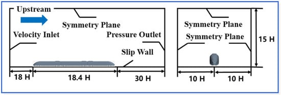The commercial software STRA-CCM+ (version 2020.3) is used to simulate the flow of the high-speed train in open line. The calculation area is shown in Figure 4. The calculation domain is 66.4 H long, 20 H wide and 15 H high. The nose tip of the head train is 18 H from the entrance of the calculation domain, and the nose tip of the tail train is 30 H from the exit of the calculation domain. The train is located in the middle of the calculation domain, and the lowest point of the wheelset is 0.05 H from the ground. The size ratio of the model to the actual high-speed train is 1:8.