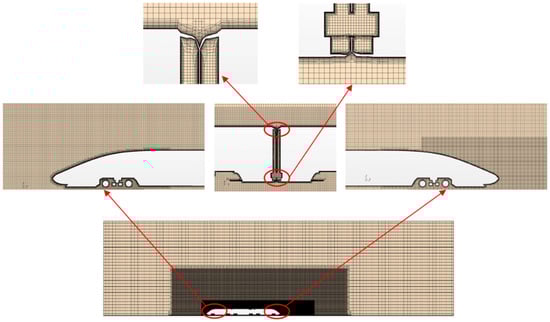 The velocity inlet boundary condition is adopted at the inlet of the calculation domain, and the incoming flow velocity is set as 111 m/s. Pressure outlet boundary conditions are adopted at the outlet. The ground is set as a no-slip boundary condition, the velocity is consistent with the incoming flow velocity, and the rest are set to symmetry plane boundary conditions. The entire computing area grid is divided by tetrahedral mesh, and the total number of meshes is about 75 million; Figure 5 is a grid schematic. Three layers of nested encryption areas are set near the train’s body, and the maximum grid scale is set to 200 mm, 400 mm, and 600 mm, respectively. Grid encryption is carried out on the train’s body, bogie, windshield and other areas to ensure the accuracy of calculation. A 15-layer grid is set on the surface of the train body, windshield and pantograph. The first layer grid thickness is set to 0.02 mm, with a growth rate of 1.2, and the thickness of the first layer of the other surfaces is set to 0.05 mm, with a growth rate of 1.2. Overall, y+ is around 1, which meets the requirements of turbulence calculation [41,42,43,44].