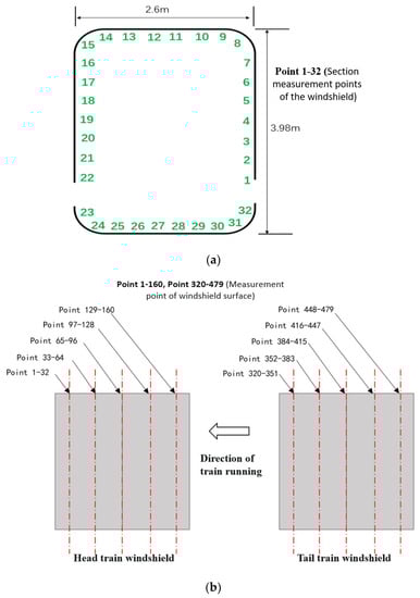 Next, in order to investigate the dynamic response of the measurement points for different positions of the windshield, the train is divided by direction of travel. Windshield 1 between the head car and the middle car and windshield 2 between the middle car and the tail car were selected for comparison in this paper, as shown in Figure 17. Each windshield was selected for comparison at the same measurement point locations as in Figure 13.