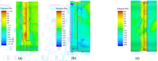 Pressure diagram of U-section rubber outer windshield surface at 400 km/h. (a) Side pressure cloud. (b) Side pressure cloud. (c) Top pressure cloud.
