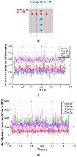 Through the flow field simulation calculation, the time history data of aerodynamic pressure of all the windshield surface measurement points shown in Figure 6 can be obtained, and the pressure change curve of the measurement points at different positions of the head train’s windshield with time is shown in Figure 9, and it can be seen from the figure that the pressure amplitude of the bottom of the train is larger and the pressure amplitude of the top of the train is small. The pressure change curves of the measurement points at different positions of the windshield in the same horizontal plane are basically the same, and only the pressure amplitude at the peaks and troughs of the pressure wave is different.