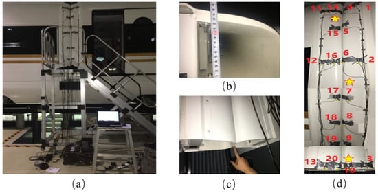 Hammer method was used to test the structural modes, and signals were collected by force sensor (force hammer) and acceleration sensor (measuring point). The lateral part of the structure of the outer windshield was selected as the main test object in this test (see Figure 11a). The thickness of the root of the U-section rubber is 18 mm, the overall width of the U-section rubber is 240 mm, and there is a pretension between the two U-section rubbers. Twenty measuring points are arranged on the side of the windshield (see red numbers Figure 11d). Three sets of tests were carried out at three different excitation points, which were above point 7, in the middle of point 14 and 15, and on the upper side of point 10, as shown by the yellow five-pointed star in Figure 11d.