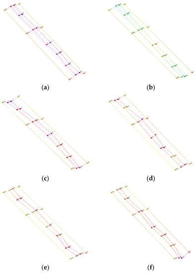 The first four mode shapes of the lateral part of the outer windshield structure. (a) = 12.02 Hz. (b) = 14.25 Hz. (c) = 18.31 Hz. (d) = 23.66 Hz. (e) = 26.72 Hz. (f) = 28.41 Hz. Nodes 1–20 correspond to the modal test points in Figure 11d and different colored lines represent the outer outline of the windshield structure.