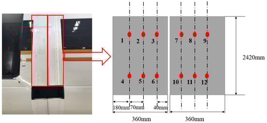 Through the calculation and analysis of the U-section rubber outer windshield structure, it is determined that under the action of aerodynamic load, only the first three modes of the outer windshield have major contributions, and the contributions of the latter modes are negligible. In order to ensure accuracy, the first six modes are used for modal superposition in the flow-induced vibration analysis of windshield structure. Figure 13 is a schematic diagram of the selection of measuring points for the displacement response of the U-section rubber outer windshield. The left part corresponds to the left windshield in Figure 10d, and the right part corresponds to the right windshield in Figure 10d. A total of 12 measuring points are selected for analysis. On a common computer, Intel(R) Core(TM) i7-10750CPU is used. The calculation time of this example is 16.74 s, which has engineering availability.