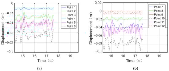 The displacement response of measurement points 1–6 (a) and 7–12 (b) on both sides of the U-section rubber outer windshield.