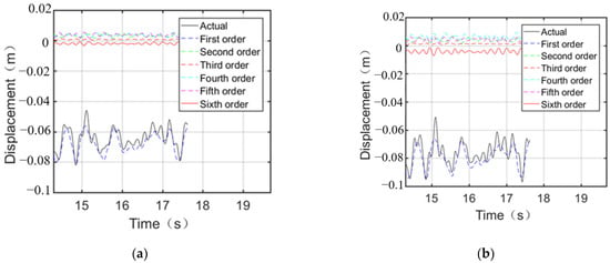 Figure 16 shows the modal contribution of displacement at measurement points 6 (left) and 10 (right). The black solid line is the actual displacement at measurement point of outer windshield, and the dashed lines in other colors represent the contribution of each mode to the displacement of outer windshield, respectively. It can be observed that for measurement points 6 and 10, the first-order mode has a strong influence on the displacement of the outer windshield, while the other modes contribute relatively little to the displacement response.