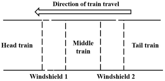 To reduce the amount of calculation, the aerodynamic simulation model of the U-section rubber outer windshield adopts a three-car marshaling test train, including the head, middle and tail trains, and two groups of outer windshield structures. The middle section of the train remains unchanged, and the shortened model has relatively little effect on the flow field structure at the first windshield of the train [40]. During the numerical simulation, the modeling is carried out in strict accordance with the installation and size of the internal and outer windshields of the test train. In addition, the train’s height H = 4.0 m is selected as the characteristic length, the width of the train is 0.8 H, and the length of the train is 20.8 H. The established model of the high-speed train is shown in Figure 2.