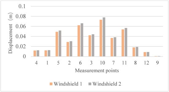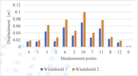 Figure 18 and Figure 19 show a comparison of the maximum and mean values of the absolute values of each measurement point for different positions of the windshield at 400 km/h of the train. It can be seen that the amplitude of displacement vibrations at each measurement point on windshield 2 is higher than that of the measurement points on windshield 1, and the same is the case for the mean values. However, the difference is not very significant near the end of the car due to the constraints. It can be concluded that the outer windshield 2 vibrates more significantly under aerodynamic load excitation than windshield 1.