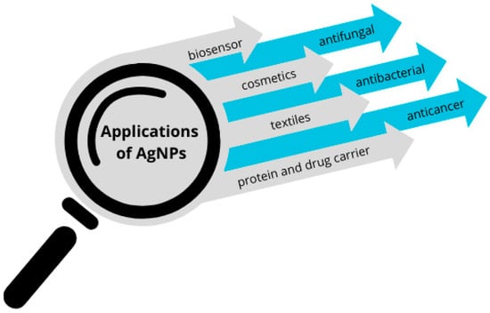 As a feed additive, it has been shown that they reduce the occurrence of pathogenic microorganisms, so they could reduce the use of antibiotics in livestock. Additionally, their potential use in water treatment has been demonstrated by incorporating them into foam filters or by the impregnation of ultrafiltration membranes. Moreover, AgNPs are good candidates for use in food packaging due to their good stability and slow release of silver ions in stored food. In the context of food safety, another approach is emerging to use AgNPs as biosensors. This approach involves creating smart packaging to detect pathogens and transforming this information into a detectable signal that would allow for the early detection of food contamination. Due to the fact that there is insufficient research on the safety of AgNPs in food, the EU does not allow their use in dietary supplements or food packaging [15]. However, in 2021, the EFSA published information in which it was concluded that the use of AgNPs as an additive in an amount of up to 0.025% w/w in polymers such as polyolefins, polyesters, and styrenes that do not swell in contact with hydrated food does not raise concerns regarding their use. A summary of the most important applications of AgNPs is shown in Figure 1.