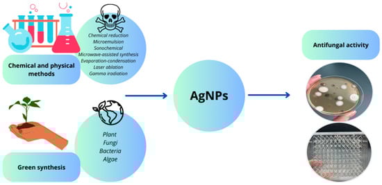 The antibacterial properties of silver nanoparticles are well known and have been confirmed by numerous studies [7,16]. AgNPs have been shown to inhibit the growth and multiplication of such bacteria as Escherichia coli, Bacillus cereus, Staphylococcus aureus, Pseudomonas aeruginosa, Citrobacter koseri, Salmonella typhi, Klebsiella pneumoniae, and Vibrio parahaemolyticus [14]. However, especially recently, a lot of research has been published on the antifungal activity of silver nanoparticles against many species of fungi. Nanoparticles synthesized by chemical, physical, and green synthesis methods are active (Figure 2). Testing the activity of AgNPs against fungi is particularly important due to the enormous resistance of pathogenic strains to systemic drugs.