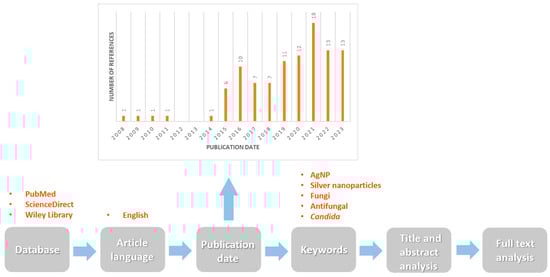 Since, in addition to antibacterial properties, AgNPs show antimycotic effects, which are less widely known, the aim of this mini-review was to survey the current literature, both original papers and reviews, on the antifungal properties of silver nanoparticles against plant and human mycopathogens with particular emphasis on the action on Candida species. The review was based on scientific publications in English mainly from 2015–2023 available in the largest biomedical databases, i.e., PubMed, ScienceDirect, and Wiley Library. The databases were searched with such keywords as silver nanoparticles, fungi, antifungal properties, and Candida. Keywords were entered in various combinations. The selection of publications was made in two stages. In the first one, the selection was made based on titles and abstracts. In the second stage, the full text was analyzed. Studies that were considered unrelated to the topic discussed in the review were rejected. The individual steps taken during the development of this review are outlined in the scheme below (Figure 3).