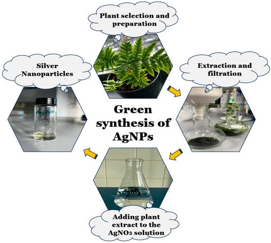 Green synthesis scheme based on the example of the synthesis of silver nanoparticles using plant extracts. The first step includes the selection and appropriate preparation of the plant, followed by the extraction process and obtaining the plant extract, which, in the next stage, is mixed with a solution of silver salts under the appropriate set of conditions. Then, the phytochemical compotes from the plant extract act as reducing agents and cause the conversion of Ag+ ions to Ag0 nanoparticles.
