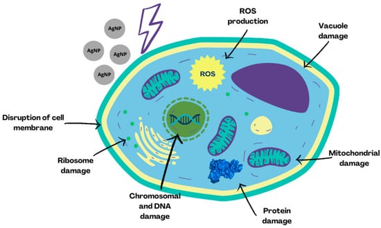 The mechanism of action of silver nanoparticles on cells has not yet been thoroughly investigated, but several most likely mechanisms have been identified (Figure 5). These include the ability to attach AgNPs to the cell wall and the ability to penetrate the cell interior, induction of oxidative stress, and interference with signal transduction and protein synthesis [97]. Researchers suggest that the ability of AgNPs to connect with the cell wall occurs as a result of the electrostatic interaction between positively charged silver ions and the negatively charged surface of the cell membrane and to then penetrate it, thus causing structural changes in the cell membrane, which in turn increases its permeability. Other researchers suggest that silver nanoparticles lead to the inactivation of enzymes and proteins associated with the membrane or change the composition of the lipid bilayer, which translates into a change in its integrity. Another example is the interaction of silver ions with the disulfide bonds of enzymes involved in cellular metabolism, causing their inactivation. It was also found that silver ions bind to the 30S ribosomal subunit, deactivate the ribosome complex, and stop protein synthesis [98]. Generally, the main mechanism of activity of AgNPs is the ability to produce reactive oxygen species that cause oxidative stress in the cell. Free radicals can cause, among other things, lipid peroxidation, damage to the integrity of cell membranes, and DNA damage, which leads to cell apoptosis. The mechanisms mentioned here were confirmed in the studies of Xia et al. on the action of AgNPs on Trichosporon asahii. Analysis under an electron microscope showed that silver nanoparticles caused damage to the cell wall and membrane and then penetrated the cells and damaged mitochondria and ribosomes. They also caused condensation and marginalization of chromatin [39]. In the study by Wen et al. using the plant pathogen Ustilaginoidea virens, it was also confirmed that AgNPs disrupt the integrity of the cell wall and cell membrane and also affect the transcription process [99]. An increase in the permeability of the cell membrane was also identified in the case of studies on the influence of AgNPs on the cells of four pathogens causing rot of kiwi fruit: Alternaria alternata, Pestalotiopsis microspora, Diaporthe actinidiae, and Botryosphaeria dothidea [100].
