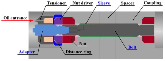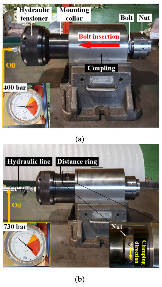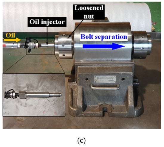 The procedures and results for coupling bolt operation are displayed in Figure 15. First, oil was applied to the hydraulic tensioner at a pressure of 400 bar, as shown in Figure 15a, which is the first tightening pressure determined from the FE analysis results. This induced the tensile force to the bolt through the adapter in the direction of the red arrow, as indicated in Figure 15a. While being inserted in the interference fit state, the bolt expanded the sleeve in the radial direction, resulting in the first tightening force by a contact pressure. Following this, a pressure of 730 bar was employed for the second tightening process, as shown in Figure 15b. With one end fixed by the nut, the bolt was tensioned, which was subsequently clamped by the nut in the distance ring, as shown in the inset of Figure 15b. When the hydraulic oil was released, the elastic behavior of the bolt generated a compressive axial force, i.e., second tightening force, on the contact surfaces between nuts and the coupling. The untightening process was performed in the reverse order of the tightening process. The clamping force in the axial direction was unloaded by tensioning the bolt with the same pressure as that of the second tightening process and loosening the nut in the distance ring. To release the radial fastening force, oil was supplied into the passage through an oil injector, as shown in Figure 15c, and the oil pressure was gradually increased within the range of the second tightening pressure. Consequently, the bolt was effectively disengaged from the sleeve in the direction of the blue arrow, as indicated in Figure 15c. The results of the experiment show that the proposed design method and FE analysis model were effective in designing the hydraulic coupling bolt, leading to sound tightening and untightening processes under the operation conditions determined through theoretical and FE analyses. Therefore, we believe that the proposed design method could be widely used to design hydraulic coupling bolts for large shaft systems.