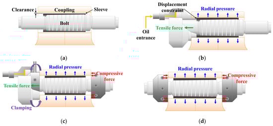 In practice, hydraulic coupling bolts are extensively employed for such a rigid coupling system. When a general-type bolt is used to secure a flange, the presence of a gap between the bolt and flange hole can potentially lead to the bolt loosening over time. To mitigate this issue, hydraulic coupling bolts use sleeves to fill the gap between the bolt and the flange hole, as shown in Figure 1. The inner surface of the sleeve and the contact surface of the bolt have a certain slope. While the structure of the coupling bolt may be somewhat complicated, it offers numerous benefits. The use of hydraulic pressure makes the tightening and loosening process fast. Furthermore, the disappearance of the gap between the bolt and the coupling hole ensures both secure fastening and efficient torque transmission. Accordingly, hydraulic coupling bolts play a crucial role in various industrial fields, including ships, power plants, and aircraft, where maintaining the structural integrity and reliability of shaft systems under continuous high-stress conditions holds the utmost significance. Figure 2 shows the tightening of the hydraulic coupling bolts [13]. First, bolts and sleeves are inserted into the flange hole (Figure 2a). Subsequently, a primary tightening load (i.e., the first tightening load) is applied to the bolt using a hydraulic tensioner as the maximum thickness part of the sleeve is restrained in the axial direction. During this process, the sleeve with an inclination on the inner surface is expanded by the bolt, resulting in radial contact pressure against the flange hole in an interference fit state, as illustrated in Figure 2b. Following this, the second tightening is performed by applying a tensile force to the bolt while fixing one end of the bolt thread with a nut (Figure 2c). Finally, a compressive force is generated between the nuts and the coupling after the oil pressure is relieved, as shown in Figure 2d.