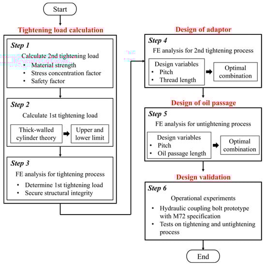 Existing studies primarily concentrated on assessing the fastening force and structural strength of coupling bolts through FE analysis and often overlooked the complete operation of the bolt, which restricts their applicability to the design process. Furthermore, there is a lack of research to verify the reliability of design and analysis results through actual operational experiments, especially when it comes to coupling bolts for large shaft systems. Therefore, in this study, an integrated design approach that encompasses both the tightening and untightening process was established for hydraulic coupling bolts with an M72 specification, which were designed for use in large shaft systems. In Section 2, the initial step involved determining the second tightening load by considering material strength and conducting a theoretical analysis that involved stress concentration and safety factors. Following this, the upper and lower limits of the first tightening load were calculated based on the thick-walled cylinder theory. FE analysis was then performed under these load conditions for the tightening process to determine the suitable first tightening force, ensuring secure fastening both axially and radially. In addition, design variables related to the shapes of the adapter (Section 3) and oil flow passage (Section 4) were selected, and a series of FE analyses was performed on the tightening and untightening process to identify the optimal variable combination from the viewpoint of structural integrity. Finally, as described in Section 5, prototypes of hydraulic coupling bolts were produced, and operational tests were performed to assess the validity of the design method proposed in this study. The entire design process is schematically illustrated in Figure 3.