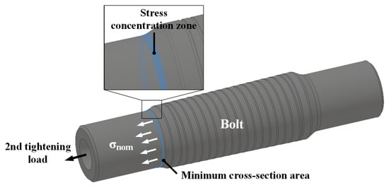 The sequence of calculating the tightening load starts with determining the second tightening load with great attention to the axial tensile stress in the bolt, which is a primary concern for operational safety during the overall tightening process. The bolt material was a low-alloy steel known as SNCM439, which contains elements, such as chromium (Cr), molybdenum (Mo), and nickel (Ni). The mechanical properties for analysis were obtained from the tensile test and are shown in Table 1. Figure 4 schematically illustrates the design of the bolt intended for use in a large shaft system, based on the existing hydraulic coupling bolt with the M72 specification, while the detailed dimensions are not disclosed in this paper. The second tightening load (F2) was determined by considering factors, such as yield stress (σy), stress concentration factor (Kt), and safety factor (SF). The stress concentration factor was estimated based on the minimum cross-section shown in Figure 4, using FE analysis (see Section 2.3). The SF, which is dependent on the operating conditions, was set to the value provided by the manufacturer. The formulas for calculating the second tightening load are shown below.