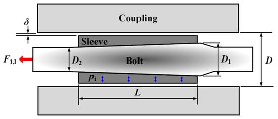 The thick-walled cylinder theory is applicable for analyzing structures with a cylindrical shape, where the thickness is greater than one-tenth of the diameter [21]. Based on the assumption that the sleeve is equivalent to a thick-walled cylinder, the upper and lower limits for the first tightening load were determined. First, the lower limit of the first tightening load (F1,l) was calculated, considering the gap (δ) between the coupling and the sleeve that exists before tightening, as depicted in Figure 5. To ensure that the sleeve sufficiently creates contact pressure with the coupling during the first tightening process, it is necessary to apply a load that expands the sleeve at least as much as the existing gap. The internal pressure required to expand the sleeve by the gap can be calculated with respect to the maximum thickness of the sleeve using Equation (6) and then converted into an axial force through Equation (7).
