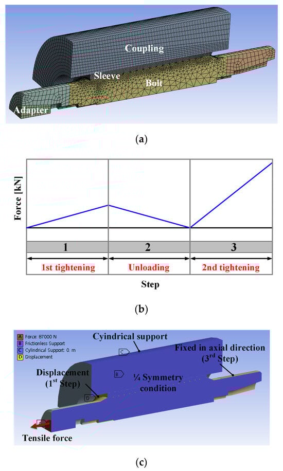 The tightening load was applied in three distinct steps, as shown in Figure 6b. Step 1 involves the first tightening process in which the bolt is inserted into the coupling hole, causing radial compressive stress. Step 2 is the unloading process of the first tightening load, and Step 3 is the second tightening process of applying axial tensile force by extending the bolt. The boundary conditions of the analysis are depicted in Figure 6c. In Step 1, the axial displacement of the thickest part of the sleeve was constrained, and in Step 2, this constraint was removed. Furthermore, in Step 3, the end of the bolt opposite to the one connected to the adapter was constrained in the axial direction to simulate the effect of being tightened with a nut. Symmetry conditions were consistently applied to the longitudinal cross-section of the bolt throughout the entire process to restrict displacement in the direction perpendicular to the plane. For the coupling, constraints were applied in directions other than the radial direction. The friction coefficient at the contact surfaces was set to 0.18 with reference to [13,19], and nonlinear analysis was conducted to account for the contact nonlinearity between the coupling and the sleeve and between the sleeve and the bolt.