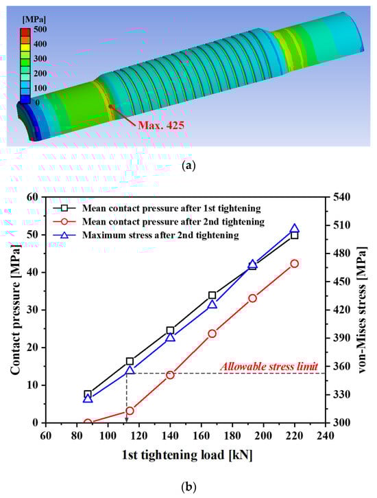 The FE analysis results for the first and second tightening processes are shown in Figure 7. First, Figure 7a represents the von-Mises stress distribution on the bolt when arbitrary first and second tightening loads were applied to a quarter FE model, set at 87 kN and 250 kN, respectively. The analysis revealed a maximum stress of 425 MPa in the fillet part of the minimum cross-section of the bolt after the second tightening process. Subsequently, the stress concentration factor (Kt) was calculated using Equation (3) based on this result. Figure 7b displays the variations in the mean contact pressure and maximum von-Mises stress on the sleeve, as the first tightening load changes while keeping the second tightening load constant. The x-axis in the graph represents the first tightening load for the quarter model. As the first tightening load increased, the mean contact pressure also increased due to an increase in the interference fit. However, after the second tightening, the contact pressure decreased in comparison to the first tightening since the bolt extended axially and reduced in diameter. Within the allowable stress limit defined by the SF, the first tightening load was 452 kN (113 kN in a quarter model), which ensures the contact pressure between the sleeve and the coupling after the second tightening. This value is approximately equivalent to 400 bar as the tensioner hydraulic pressure. Figure 7c illustrates the contact pressure distribution on the sleeve after the entire tightening process under the load conditions, as per the design results, while Figure 7d shows the von-Mises stress distribution on the sleeve. It was observed that the clamping load in the radial direction was secured, as evidenced by the contact pressure generated across the entire contact surface between the sleeve and the coupling after the second tightening process. Meanwhile, the contact pressure decreased as the thickness of the sleeve increased because the expansion of the outer surface of the sleeve was relatively reduced. In addition, the analysis of stress distribution on the inner surface of the sleeve in contact with the bolt confirms that the structural integrity of the sleeve can be maintained after the tightening process.